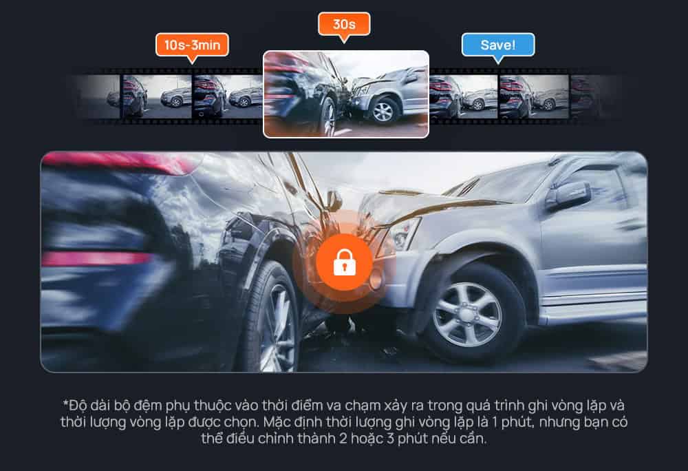 - Tính năng ghi hình khẩn cấp có bộ đệm cho phép lưu lại 3 phút trước va chạm và 30 giây sau va chạm. Điều này giúp người dùng có đầy đủ bằng chứng về nguyên nhân và toàn bộ diễn biến sự cố đã xẩy ra.