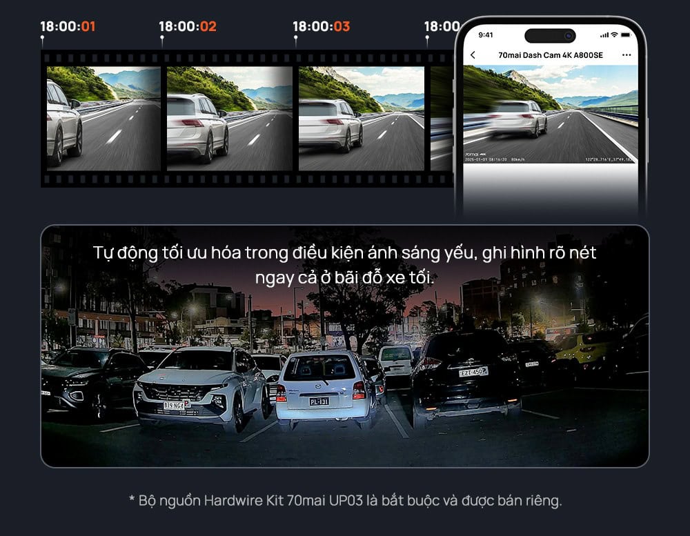 - 70mai A800SE sử dụng cảm biến cao cấp, ghi hình thực 4K UHD (3840×2160) ở tốc độ khung hình 30FPS/giây, đảm bảo từng chuyển động được lưu lại mượt mà và sắc nét. HDR phần cứng giúp xử lý dải sáng rộng, cân bằng ánh sáng – bóng tối khi đi ban ngày nắng gắt, vào hầm hoặc ban đêm.